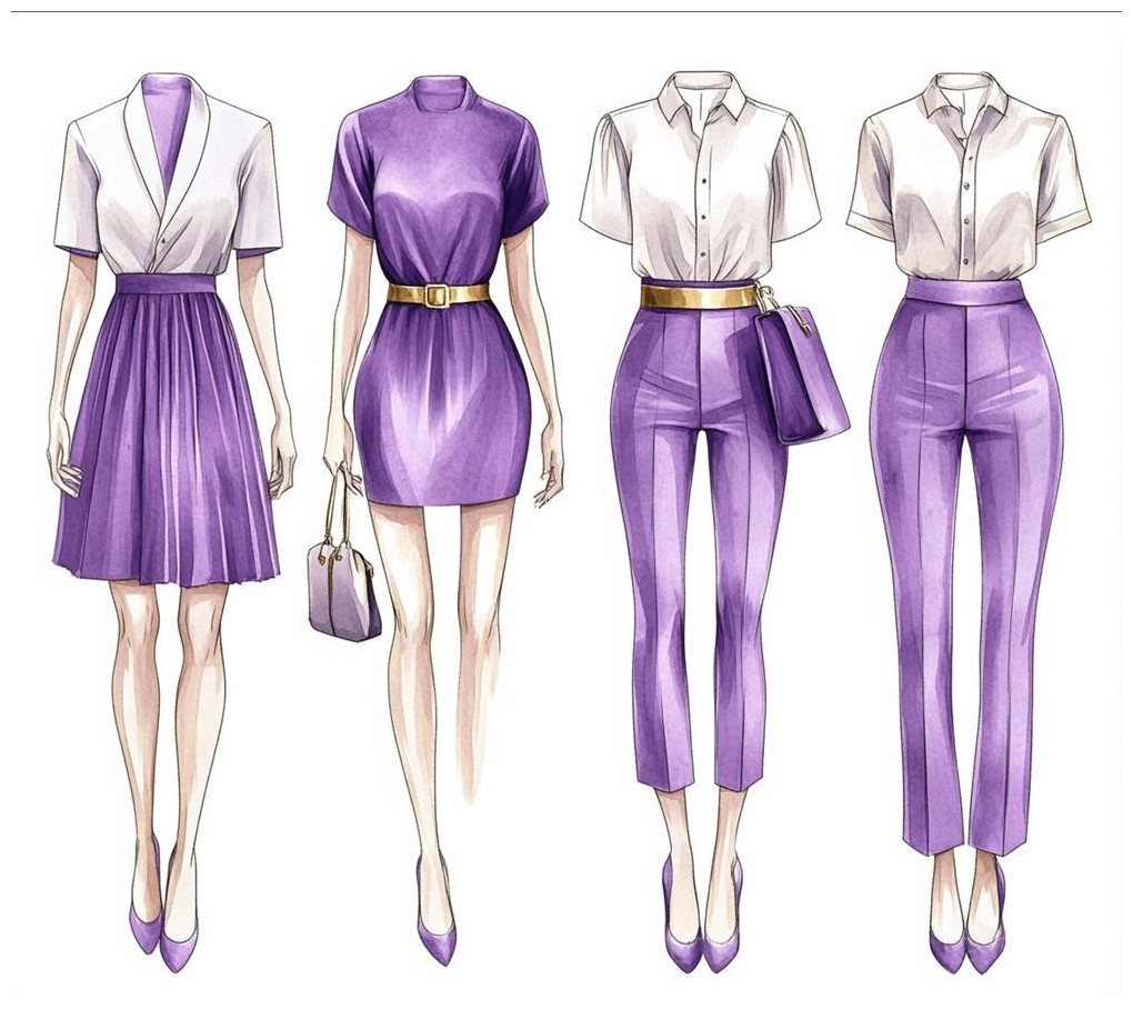 Minh họa phác thảo thời trang với phối màu tím và trắng, gồm bốn dáng người toàn thân ở góc chính diện trong trang phục công sở thanh lịch. Các thiết kế bao gồm váy và quần, tay ngắn, thắt lưng vàng, giày cao gót, tôn dáng với đôi chân dài. Phong cách đơn giản nhưng tinh tế, phù hợp cho môi trường làm việc, giờ nghỉ hay sự kiện công ty. Hình vẽ theo phong cách vector phẳng, màu sắc rõ ràng, không chi tiết ảnh thực, tập trung vào đường nét và chất liệu vải.
